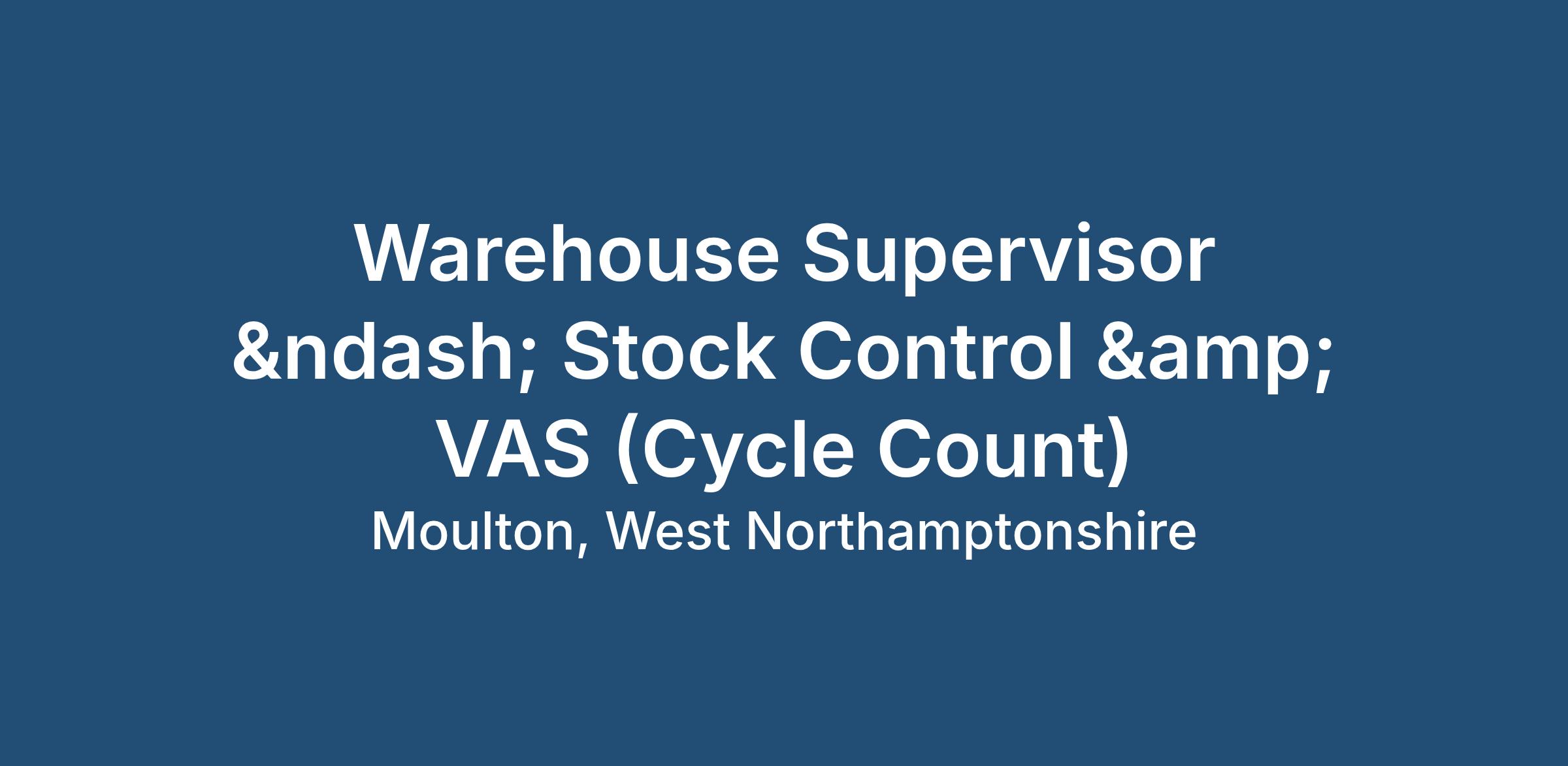 We are looking for a Warehouse Supervisor in Northampton to join our team, focusing on Stock Control, Cycle Counts, and Value Added Services (VAS). You’ll play a key role in maintaining high levels of inventory accuracy while ensuring all VAS activities are carried out efficiently and meet customer standards.